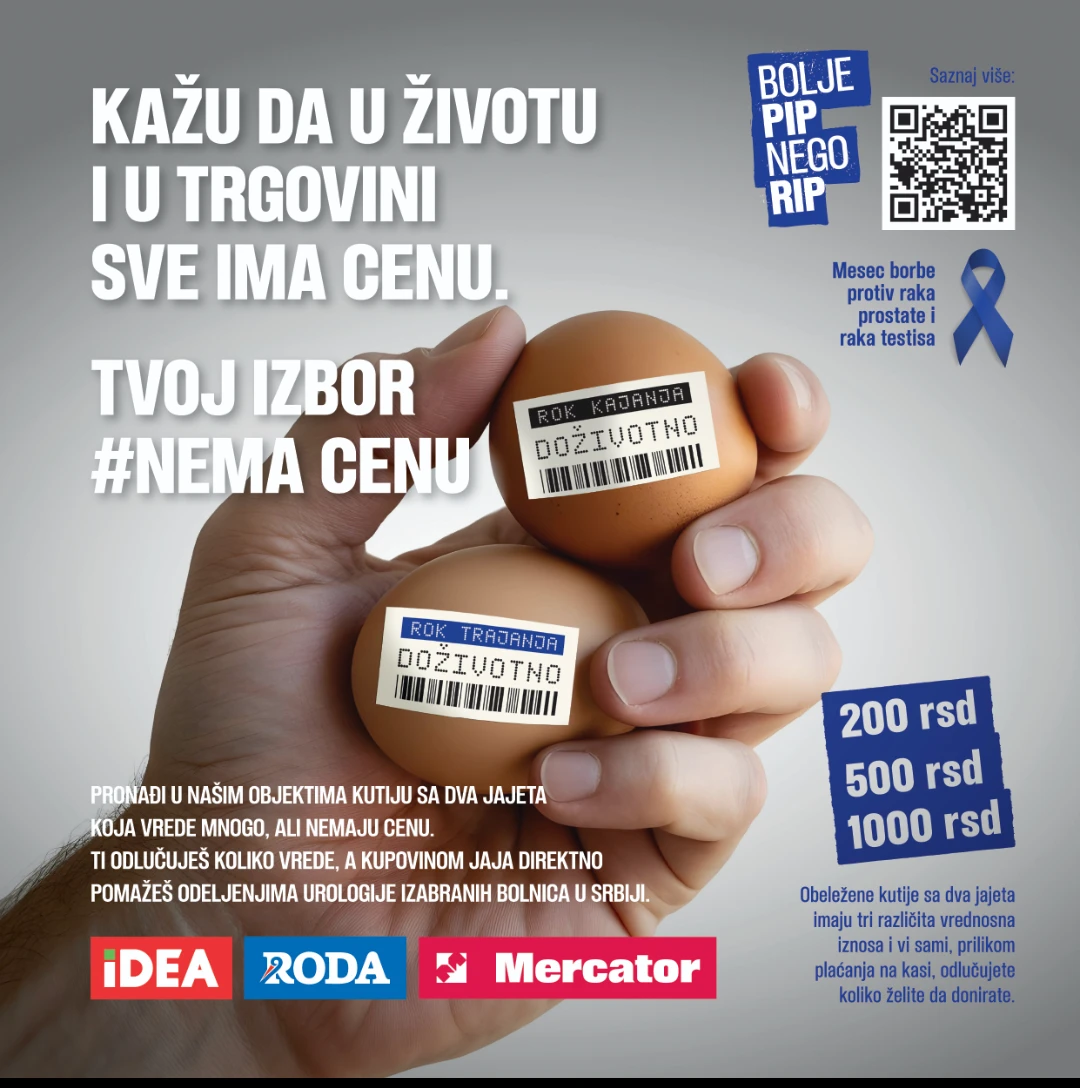 Tokom trajanja kampanje, od 28. novembra do 31. decembra, u 20 odabranih IDEA, Roda i Mercator prodavnica širom Srbije potrošači imaju priliku da podrže akciju kupovinom kutije sa dva jaja koja vrede mnogo, ali nemaju cenu. Kutije sa jajima dostupne su u 3 ponuđene opcije, a vrednosni iznos odabraće sami kupci. Sav prihod od prodaje biće doniran urološkim odeljenjima odabranih bolnica u Srbiji.