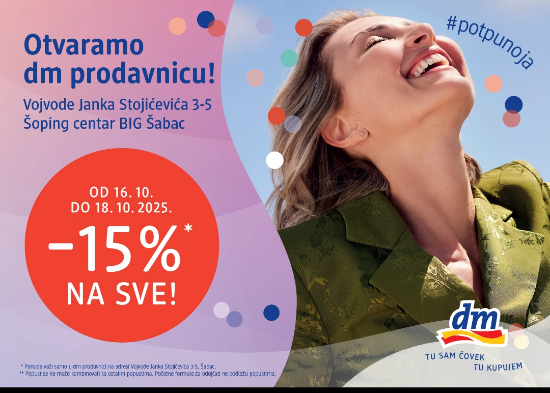 Šabac. – Kompanija dm drogerie markt nastavlja sa širenjem svoje prodajne mreže otvaranjem nove, moderne prodavnice u Šapcu. Nova prodavnica, smeštena na adresi Vojvode Janka Stojićevića 3–5 u sklopu šoping centra BIG Šabac, otvara svoja vrata u četvrtak, 16. oktobra, donoseći stanovnicima ovog grada prepoznatljivo iskustvo kupovine.