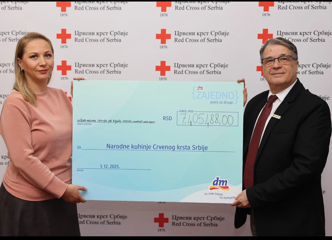Beograd.– Zahvaljujući hiljadama kupaca koji su i ove godine učestvovali u inicijativi Giving Friday, kompanija dm donirala je rekordnih 7.405.488,00 dinara Narodnim kuhinjama Crvenog krsta Srbije. Donacija je obezbeđena izdvajanjem 5% od celokupnog prometa ostvarenog 28. novembra u svim dm prodavnicama i na online kanalima, čime je nastavljena dugogodišnja tradicija kompanije dm posvećena pomoći onima kojima je podrška najpotrebnija.