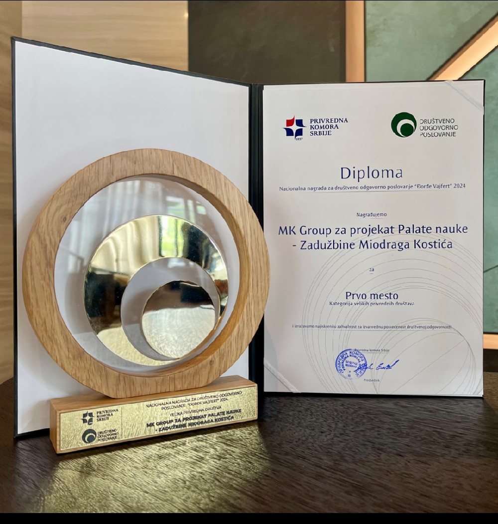 Beograd. godine – Kompanija MK Group i projekat Palata nauke dobitnici su prestižne nacionalne nagrade „Đorđe Vajfert” za 2024. godinu koju Privredna komora Srbije dodeljuje jubilarni deseti put. Ovaj projekat osvojio je prvo mesto.