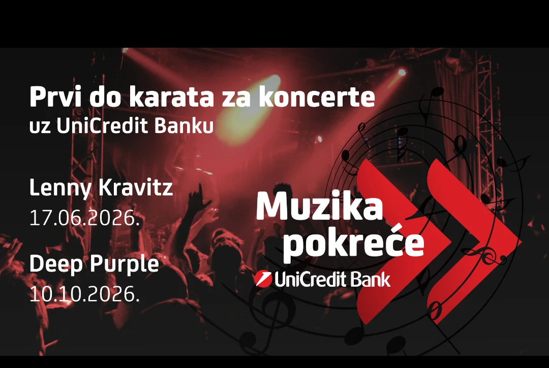 Beograd. – UniCredit Banka, u saradnji sa eFinity vodećom online platformom za kupovinu ulaznica, vam daje priliku da prvi obezbedite svoje mesto na predstojećim koncertima u organizaciji Skymusic-a: Lenny-ja Kravitz-a koji se održava 17. juna 2026, na Ušću, kao i legendarne grupe Deep Purple, 10. oktobra 2026, u Beogradskoj Areni.