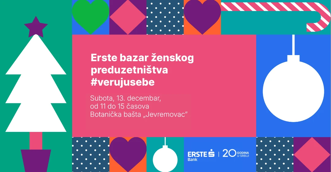 Praznični Erste Bazar ženskog preduzetništva #verujusebe, koji se ove godine održava treći put zaredom, biće organizovan 13. decembra u Botaničkoj bašti „Jevremovac“. U godini kada Erste Banka obeležava značajan jubilej – 20 godina poslovanja u Srbiji – ovaj Bazar dobija dodatnu simboliku kao mesto okupljanja žena koje veruju u sebe i svoje ideje, stvaraju nove mogućnosti i doprinose razvoju ravnopravnijeg društva. Ulaz je slobodan za sve posetioce, a događaj traje od 11 do 15 časova.