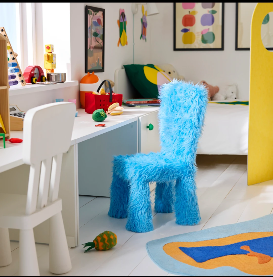 MAMMUT stolica, klasični IKEA komad za decu nastao pre tri decenije, dobija novu „kostim“ zahvaljujući mekoj, čupavoj navlaci u nežno roze ili plavoj boji. Tabure za odlaganje otkriva svoje „unutrašnje čudovište“ tek kada se otvori – široki osmeh sa zubićima koji kao da grickaju sve što se nađe unutra – unosi dozu zabave u svaki prostor. A klackalica, dizajnirana u obliku ptice, jednako funkcioniše i kao skulptura i kao igračka.