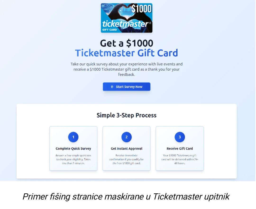 Na primer, istraživači iz Threat Research Expertise Center-a kompanije Kaspersky nedavno su otkrili fišing stranicu koja se predstavljala kao Ticketmaster. Sajt je mamio posetioce primamljivom ponudom da popune kratak upitnik i dobiju poklon karticu vrednu 1.000 dolara. Da bi “preuzeli” nagradu, žrtve su bile upućene da plate malu proviziju. Međutim, nakon uplate nisu dobile ni obećanu nagradu, ni povraćaj novca, već su ostale praznih ruku i dodatno izložene novim oblicima prevare.