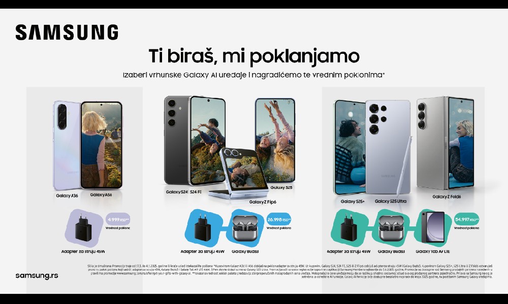 Samsung uvodi posebnu Galaxy promociju od 27. marta do 4. maja 2025. godine ili do isteka zaliha. Korisnici koji kupe Galaxy A36 ili A56 dobijaju 45 W strujni adapter. Oni koji se odluče za Galaxy S24, S24 FE, Z Flip6 ili S25 na poklon dobijaju 45 W strujni adapter i Galaxy Buds3 slušalice. Korisnici koji kupe Galaxy S25+, S25 Ultra ili Z Fold6 će dobiti 45 W strujni adapter, Galaxy Buds3 slušalice i Tab A9 LTE. U okviru ove ekskluzivne ponude, korisnici će dobiti ne samo najsavremeniji telefon, već i osnovnu dodatnu opremu za još bolje Galaxy iskustvo. Novi Galaxy uređaji se ističu po svojim naprednim AI kapacitetima, kvalitetnim ekranima i dugoročnoj softverskoj podršci i tako korisnicima pružaju savršeno mobilno iskustvo okrenuto ka budućnosti.