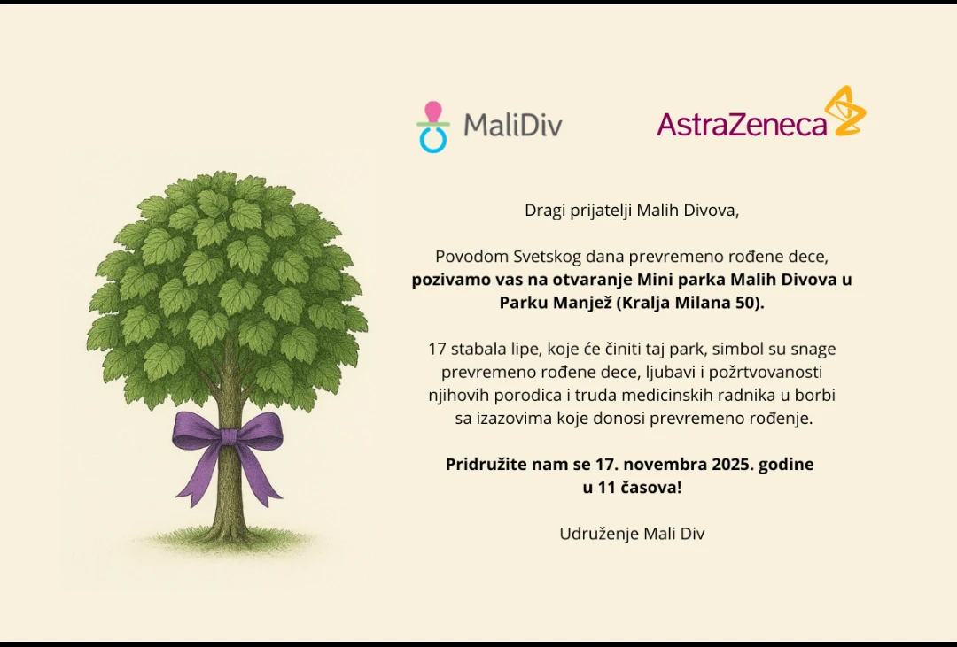 Dan kasnije, 17. novembra u 11 časova, u Parku Manjež u Beogradu, Udruženje “Mali Div”, takođe uz podršku kompanije AstraZeneca, organizuje svečano otvaranje Mini parka Malih Divova, koji čini 17 novoposađenih stabala lipe.