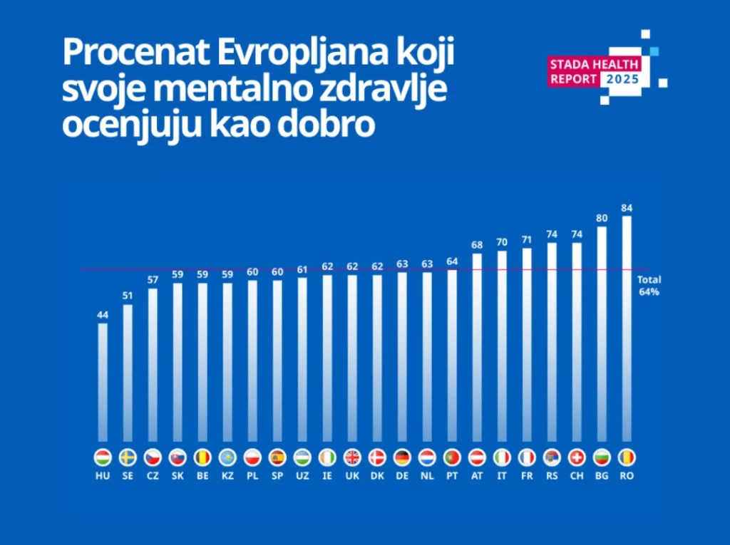 Beograd. – Mentalno zdravlje postaje jedan od ključnih zdravstvenih izazova savremenog društva u Evropi, pokazuje ŠTADA Zdravstveni izveštaj za 2025. godinu. Iako se svest o mentalnom zdravlju povećava, podrška i dalje ostaje nedostupna za milione građana, a digitalne navike dodatno komplikuju svakodnevni stres. Prema rezultatima istraživanja, 64% Evropljana ocenjuje svoje mentalno zdravlje kao „dobro“, što predstavlja nastavak blagog ali stabilnog opadanja u odnosu na prethodne godine (65% u 2024. i 67% u 2023.). Istovremeno, 36% građana ima probleme sa mentalnim zdravljem, a 9% ga ocenjuje kao „loše“ ili „veoma loše“. Glavni pokretači stresa duboko su ukorenjeni u svakodnevnom životu, tako da se finansijske brige (26%) i stres na poslu (24%) izdvajaju se kao dominantni faktori. Srbija se, sa 74% građana koji svoje mentalno zdravlje ocenjuju kao dobro, nalazi među prvih pet evropskih zemalja, rame uz rame sa Švajcarskom, a odmah iza Rumunije (84%) i Bugarske (80%).
