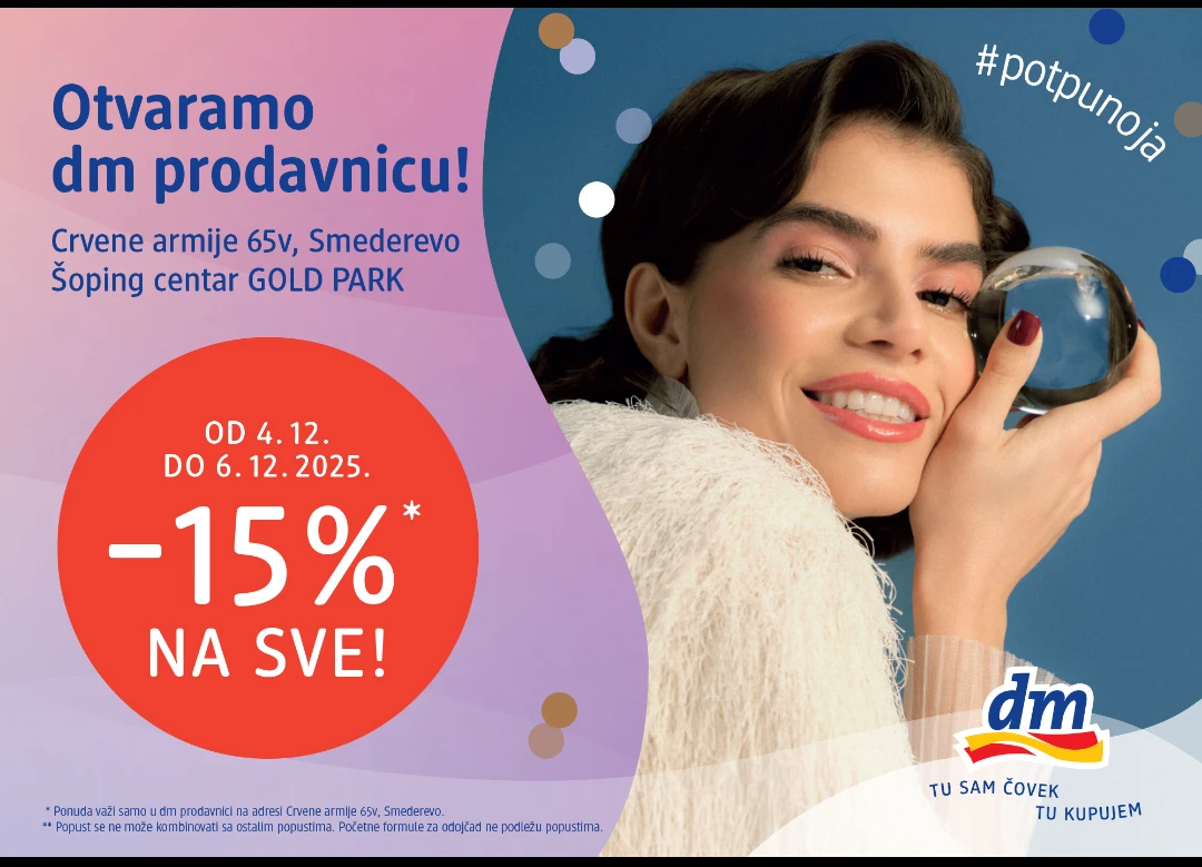 Smederevo, 4. 12. 2025 – Kompanija dm drogerie markt s velikim zadovoljstvom je saopštila otvaranje još jedne prodavnice, ovoga puta u Smederevu. Reč je o trećoj po redu prodavnici poznatog drogerijskog lanca u ovom gradu, a svečano otvaranje upriličeno je u četvrtak, 4. decembra, s početkom u 9 sati, na adresi Crvene armije 65v.