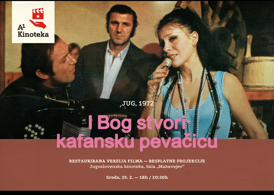 U okviru projekta A1 Kinoteka, koji Jugoslovenska kinoteka realizuje u saradnji sa kompanijom A1 Srbija, biće prikazan digitalno restaurirani film „I Bog stvori kafansku pevačicu“ (1972, Centar film), u režiji Jovana Živanovića. Premijerna projekcija planirana je u sredu, 25.2.2026. u sali Makavejev Jugoslovenske kinoteke, u Uzun Mirkovoj 1, u terminima od 18.00 i 20.30 časova, uz slobodan ulaz.