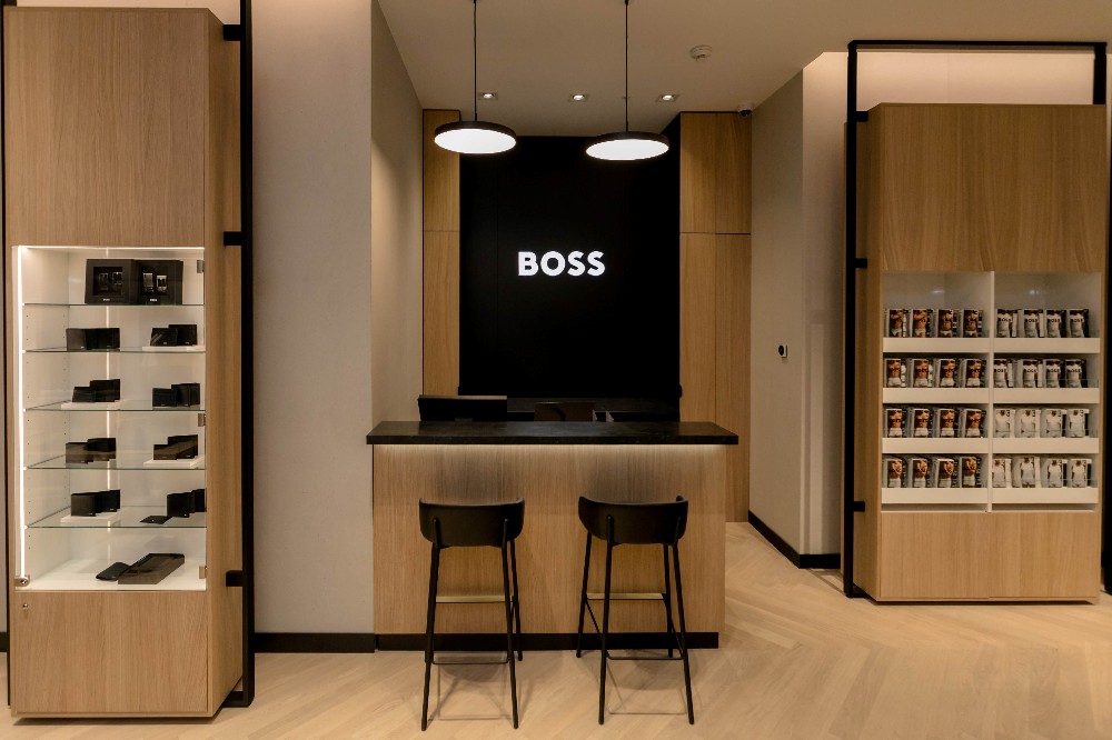 Enterijer radnje osmišljen je u skladu sa prepoznatljivim, modernim vizuelnim identitetom BOSS-a. Pažljivo odabrani materijali i boje stvaraju savršenu harmoniju luksuza i topline. Podovi od toplog drveta, elegantni metalni detalji i travertino dezen uz crni mermer visokog sjaja doprinose ekskluzivnoj atmosferi. Prostrane lounge zone i interaktivni digitalni ekrani omogućavaju posetiocima da se u potpunosti prepuste BOSS iskustvu i uživaju u kupovini.